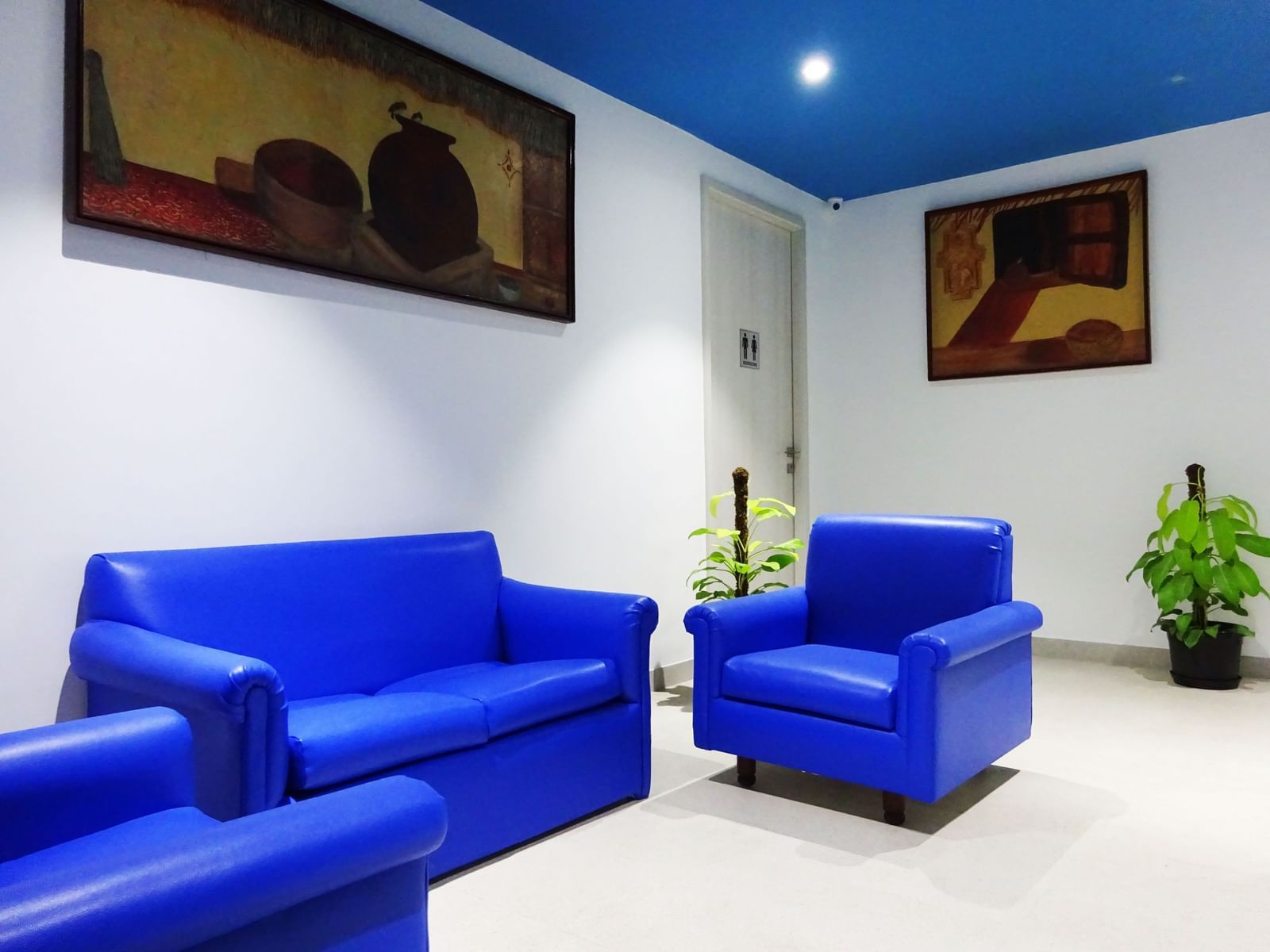 Sip on a lovely cup of coffee or a steaming mug of tea (black, chai, or good old lemon) while you wait for everyone to join you on our bright blue couches!